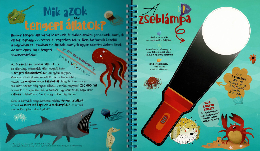 A könyv strapabíró, vastag kartonból készült, így bátran lapozgatható újra és újra. Minden jelenet egy-egy tenger alatti élőhelyet mutat be: korallzátonyokat, mélytengeri régiókat, tengerparti öblöket és nyílt óceánokat. A gyerekek a csodalámpát használva különféle állatokat fedezhetnek fel: delfint, polipot, bohóchalakat, ráját, teknőst, medúzát, tengeri csillagot – és még sok más izgalmas lényt.