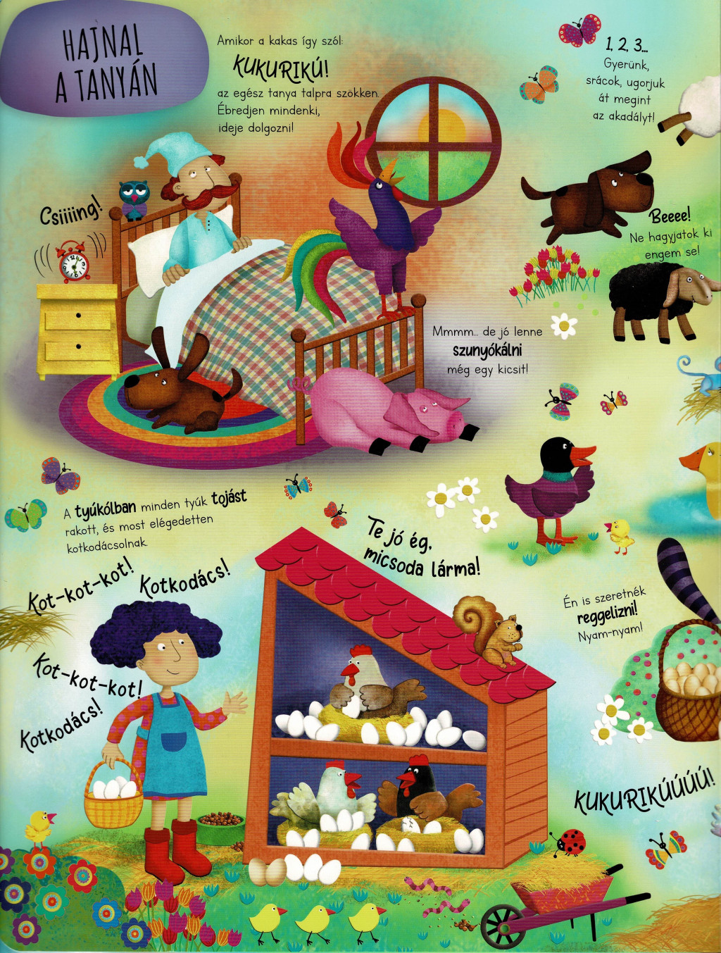 A könyv egy hajnal képével indul, ahol a kakas hangos kukorékolása ébreszti az egész tanyát. Az oldalak tele vannak életvidám jelenetekkel: a kacsák az úszóleckéjüket veszik, a bárányok ugrándoznak a legelőn, a tyúkok pedig friss tojásokkal lepik meg a gazdát. Az istállóban a tehenek fejésével kezdődik a nap, míg a kertben a zöldségek és gyümölcsök gondozása zajlik. A könyv minden részlete arra ösztönzi a gyerekeket, hogy felfedezzék a tanyasi élet különböző mozzanatait, miközben fejlesztik megfigyelőképességüket.