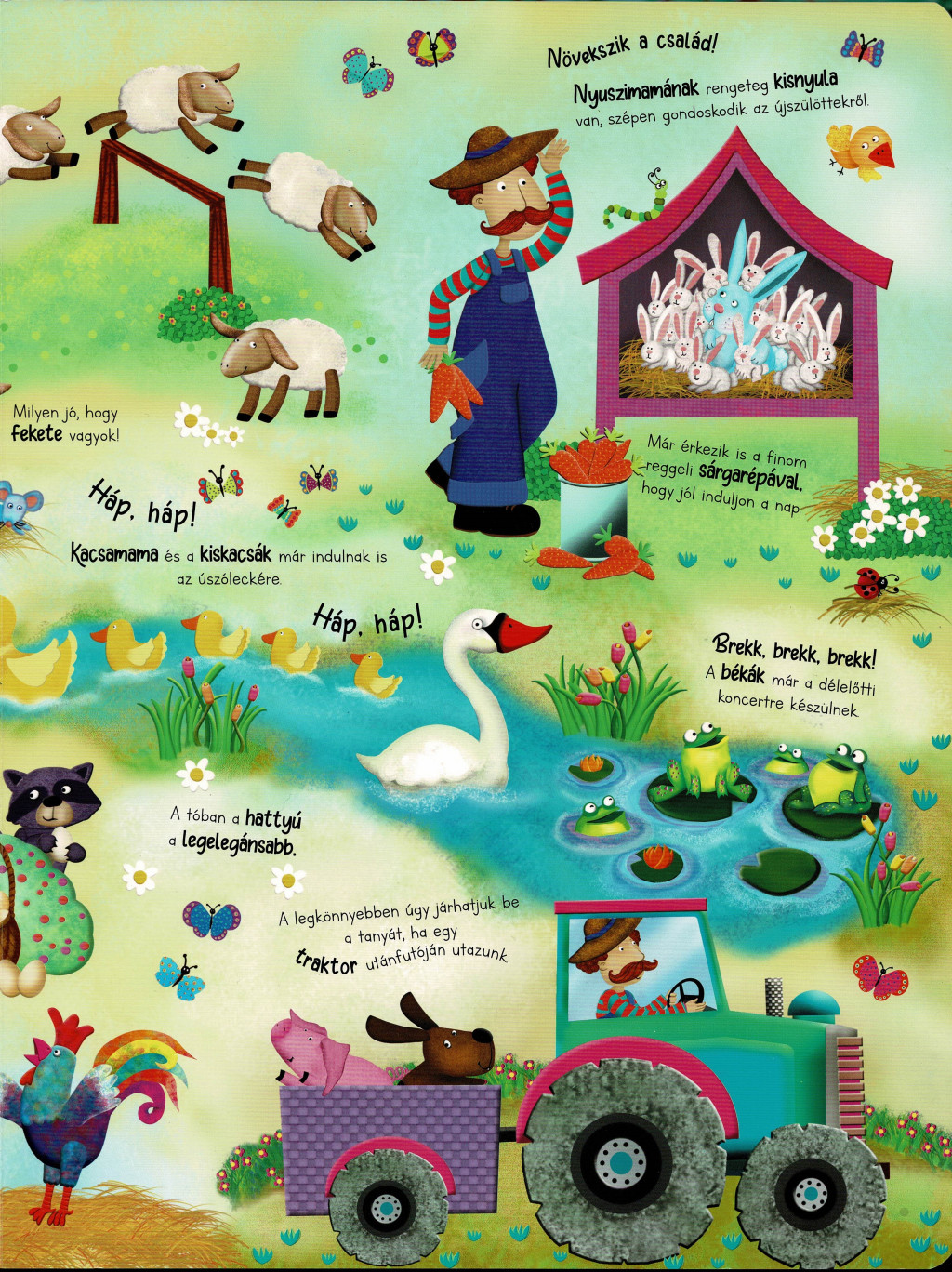 A gazda munkájának bemutatása is fontos része a könyvnek. A gyerekek megtudhatják, hogyan készül a tejből sajt és vaj, hogyan ültetik el a növényeket a kertben, vagy hogyan készítik elő a földet a traktor segítségével. Eközben különféle állatok kísérik őket a felfedezőúton: a kíváncsi malacok, a játékos kutyák és a dolgos lovak mind szereplői ennek a színes világnak. A könyv bepillantást nyújt a tanyasi élet humoros és kedves pillanataiba is, például amikor a gyerekek meglátják, hogyan hemperegnek a malacok a sárban, vagy amikor a tyúkok versengve kotkodácsolnak.