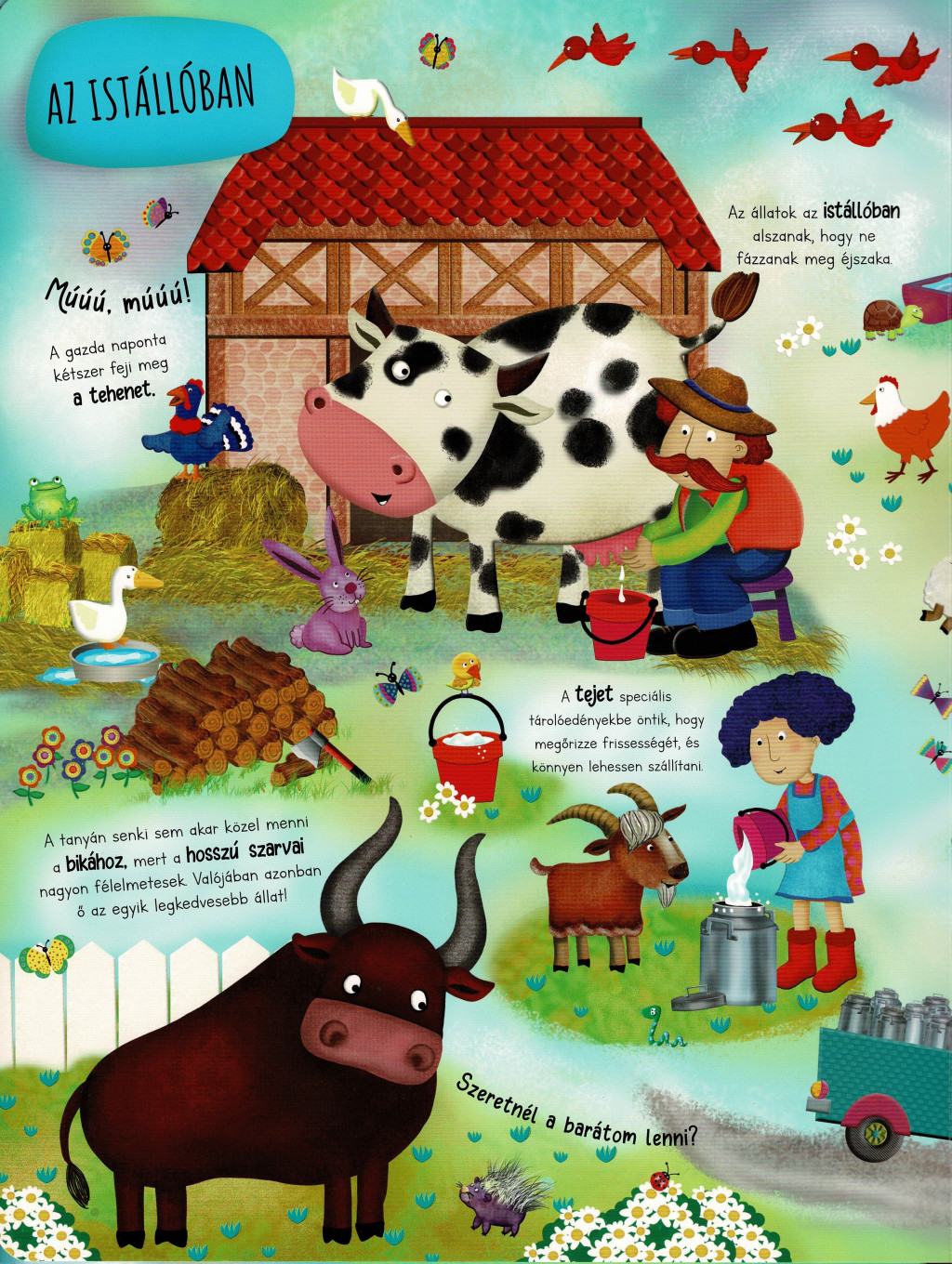 Ez a gyerekkönyv gazdagon illusztrált oldalain részletgazdag jelenetek mutatják be a tanya mindennapjait és az ott élő állatok életét. A gyerekek játékos formában ismerhetik meg a gazdaság különböző területeit, az istállótól kezdve a baromfiudvaron át a kertig, miközben érdekes történetek bontakoznak ki előttük.